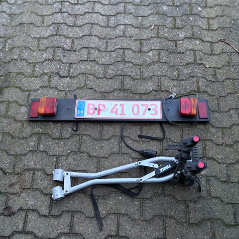 Thule Xpress 970 cykelholder med tilhørende lygtebom fra AVDanmark og Tipco Quick-Fit nummerpladeholder.