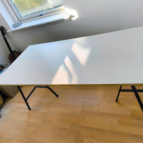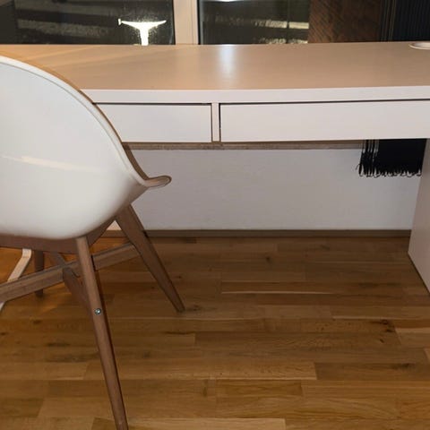 2 skriveborde, 2 skrivebordsstole og 2 gulvbeskyttere fra IKEA sælges.