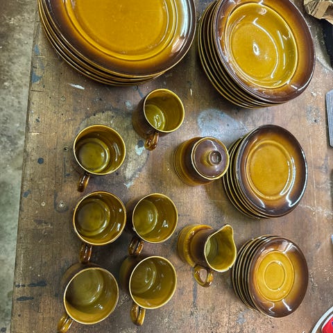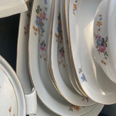 Der ud over er der bl.a. kartoffel skåle, sovseskåle et stort fad og to mindre + diverse skåle til surt eller småkager