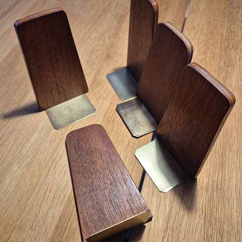 Jeg sælger disse forskellige bogstøtter i lys (måske teak eller eg?), teak og palisander.