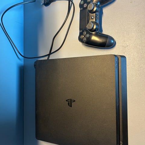 Sony Playstation 4 konsol i sort. Standard PS4-model med tilhørende DualShock 4-controller som vist på billedet. Velegnet til spil, streaming og underholdning via HDMI-tilslutning til tv eller skærm.