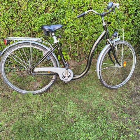 Cyklen blev købt i en cykelbutik for ca. et halvt år siden og er udstyret med ny kurv, LED-lygter og lås. Den er kun blevet kørt få gange og har derefter stået i kælderen.