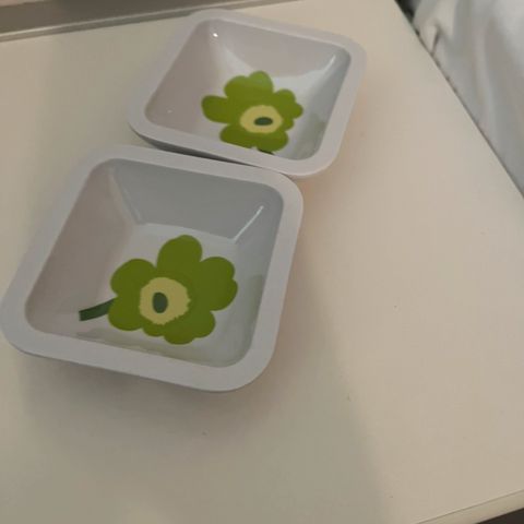 To søde Marimekko skåle med grøn Unikko blomst