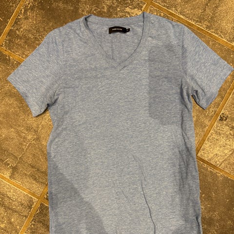 Blå stribet Samsøe Samsøe t-shirt i størrelse L. Fin stand. Sælger er 180 høj og vejer 70 kg.