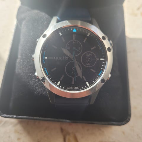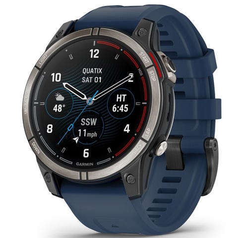 Garmin Quatix 6 smartwatch med rund urskive og blå silikonerem. Uret har metalfront med flere fysiske knapper til betjening og digital farveskærm.