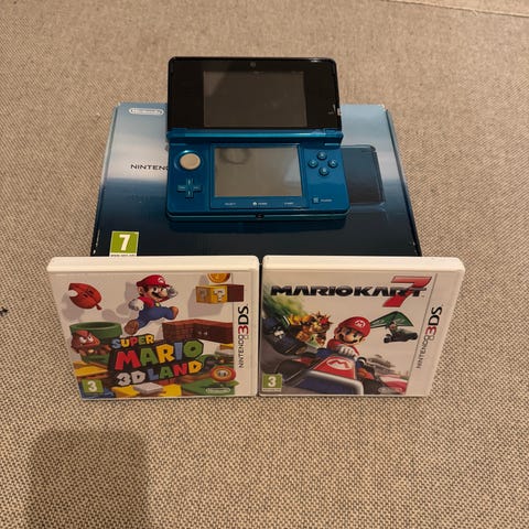 Nintendo 3DS håndholdt spillekonsol i blå farve. Konsollen har to skærme, hvor den nederste har touchskærm, samt styrepind, retningsknapper og funktionsknapper. Der medfølger oplader og et starterkit med etui, stylus og 6 forskellige spil. Der er både Mario Kart 7, Batman 2, Cars, LEGO Pirates of the Caribbean, Pokémon Alpha Sapphire og LEGO Star Wars III. Åben for bud.