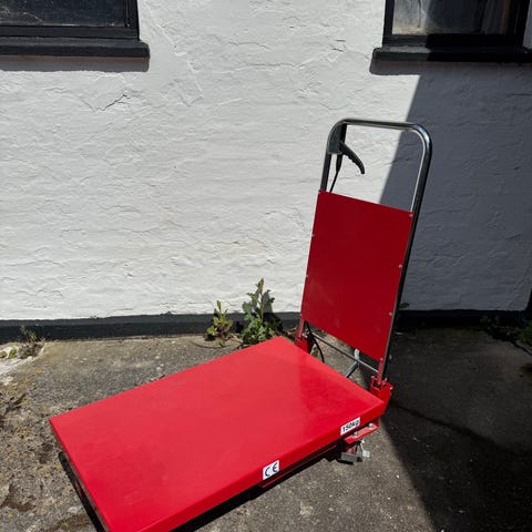 Spangkilde Teknik løftevogn i rød metaludførelse. Vognen er udstyret med to hjul til frem/tilbage samt to hjul til side manøvrering. Enheden har kædetræk og mekanisk løftemekanisme, som betjenes fra midtersektionen. Max løftehøjde er 1325 mm. Gafler kan afmonteres for lettere transport. Der er også sidearme der kan trækkes ud for støtte ved brede vinduer/døre. Max løft 200 kg.