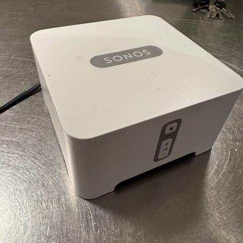 Sonos netværksenhed til lydsystem. Enheden har to Ethernet-porte til kablet netværksforbindelse samt strømtilslutning. Bruges som del af et Sonos lydsystem til at forbinde højttalere og andre Sonos-enheder til hjemmenetværket.