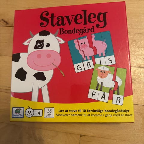 Staveleg Bondegård spil. Brætspil med stavebrikker og illustrationer af dyr fra bondegården, hvor børn kan øve sig i at stave ord som ko, hest, får, mus, ged, gås, gris, høne, hund og kanin. Spillet er velegnet til børn fra ca. 4 år og opefter og kan spilles af flere deltagere. Indeholder i alt 35 dele/brikker, som bruges til at samle ord og billeder. Spillet er beregnet til indendørs brug og er markeret med CE-mærkning.