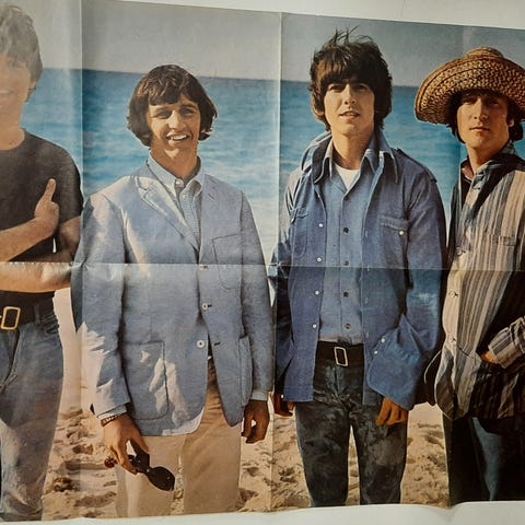 The Beatles plakat med motiv af bandmedlemmer nederst. Tekst på plakaten angiver “27 No 1 singles on 1 CD”. Trykinformation og webadresse er angivet langs nederste kant. Velegnet til ophængning som musikrelateret vægdekoration.