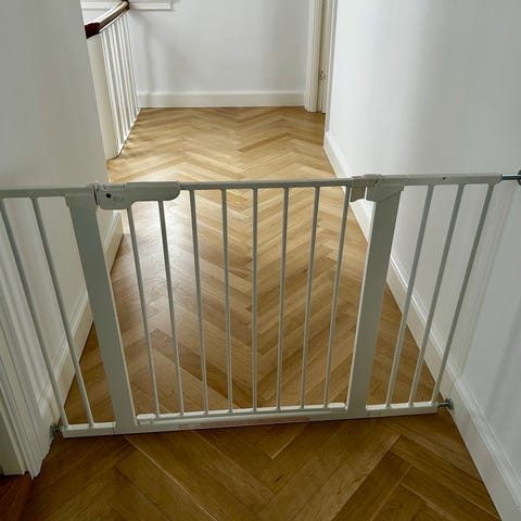 BabyDan Olaf sikkerhedsgitter i hvidlakeret metal. Bredt sikkerhedsgitter egnet til afskærmning af døråbninger, trapper eller større åbninger. Består af sektioner med lodrette tremmer og vægbeslag til montering. Kan typisk justeres i bredden ved hjælp af de medfølgende sektioner, som ses på billederne. Velegnet til brug i hjemmet for at afskærme områder for små børn eller kæledyr.