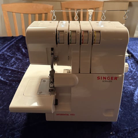 Singer 14U34A overlocker symaskine i bordmodel. Maskinen er beregnet til overlock-syning af tekstiler og kan anvendes til kantning, sammensyning og afslutning af sømme. Modellen har flere trådkegler og trådspændingsregulering på fronten samt integreret kniv til beskæring af stofkanten under syning. Egnet til hobbybrug og til syning af tøj og boligtekstiler i forskellige stoftyper.