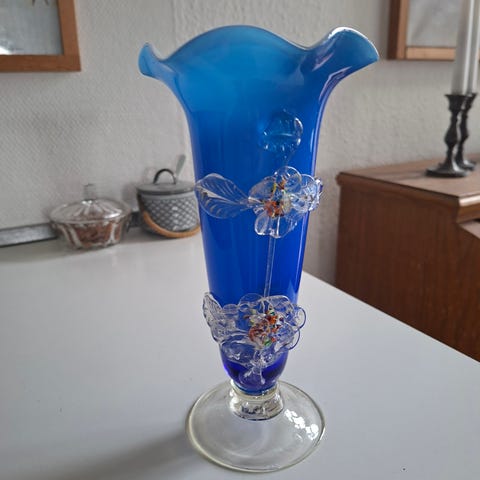 22,5 høj x 11,5 Ø. Farven er massiv, dyb mættet orange (fotos rammer ikke helt farven). Opalglas. Produceret i begyndelsen af 60erne af Dalian Glass co.