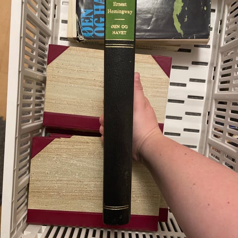 Ernest Hemingway "Øen og havet" bog. Dansk oversættelse af romanen "Islands in the Stream", udgivet af Lademann Forlagsaktieselskab, København. Trykt i Danmark med sats i Baskerville hos S. L. Møllers Bogtrykkeri. Indbundet udgave med omslag, dansk tekst.