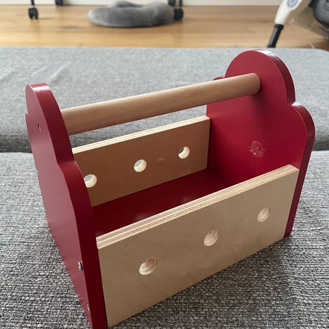 IKEA træværktøjskasse legetøj i træ i farverne grøn, natur, grå og gul. Værktøjskassen har håndtag i træ og sider med huller til skruer og bolte. Medfølgende skruer og møtrikker i træ kan skrues i og ud af hullerne. Egnet som rollelegsværktøj til børn, der vil efterligne gør-det-selv-arbejde. Robust konstruktion i træ med afrundede kanter.