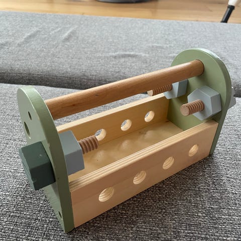 IKEA legetøjsværktøjskasse i træ i rød og naturfarvet. Kassen har bærehåndtag i træ og sider med huller, der kan bruges til at fastgøre legetøjsværktøj eller skruer. Egnet som rollelegsværktøj til børn, der leger håndværker eller værksted. Fremstillet i malet og ubehandlet træ med afrundede kanter.