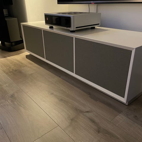 Møblet har sorte stoflåger, tre rum og masser af muligheder for diskret kabelføring. Midterste rum er inddelt af en hylde. De andre har god plads til vinyler.