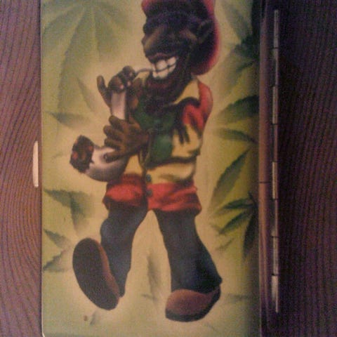 Brand new cigarette case in black faux leather with embossed structure. Never uswd. The case has a metal frame and opens with a click lock. Inside there are two compartments with elastic straps to keep cigarettes or other small items in place. Suitable for storage and transport in a pocket or bag.