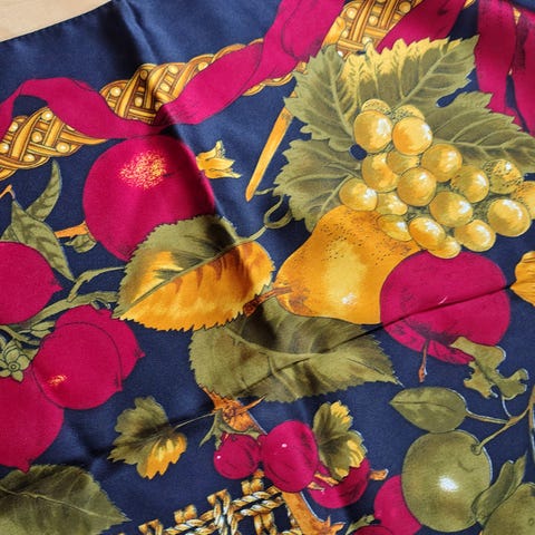 Fint “Fiorucci” tørklæde i muntert mønster og klare farver. Det er lavet af silkelignende stof og måler 88 x 88 cm.