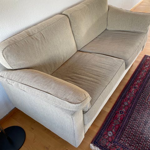 Velholdt 2-personers sofa i tidløst design med lyse, neutrale hynder og træben. Stoffet er slidstærkt og let at matche med enhver indretning. Sofaen er både komfortabel og kompakt, hvilket gør den ideel til stuen, kontoret, gæsteværelset eller sommerhuset.