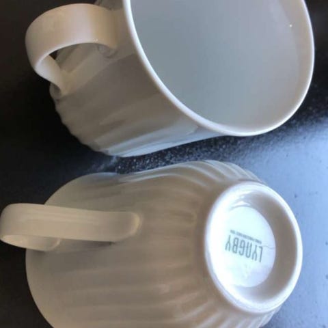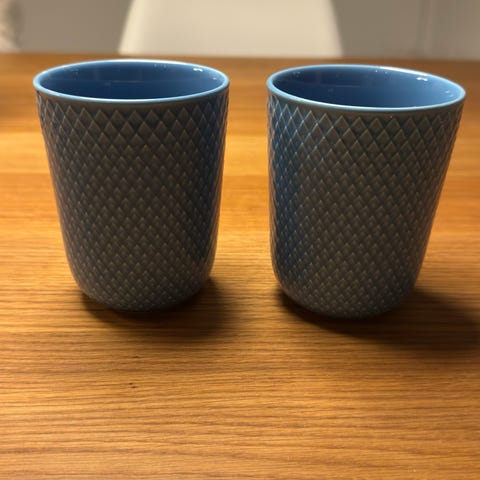 Lyngby krus i grøn porcelæn. Krusene har rillet, mønstret overflade og hank. Velegnet til varme drikke som kaffe, te eller kakao. Sælges som sæt med to krus.