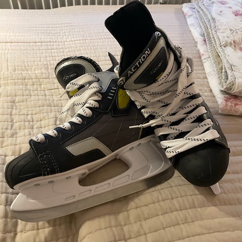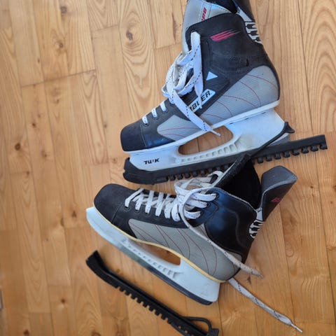 Head ishockeyskøjter i størrelse 42. Skøjterne er sorte med hvide snørebånd og hvid klingeholder. Overdelen er i syntetisk materiale med polstret skaft og inderside for støtte og komfort. Velegnet til ishockey og generel skøjteløb på is.