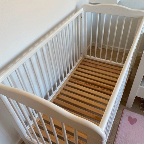 Klassisk, enkel ramme med hoved- og fodende i hvid og trælameller, der giver støtte til madras. Brugt af barn fra 1-7 år.