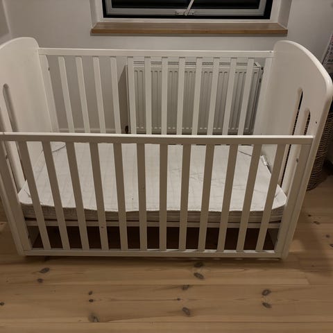 Tremmeseng i hvidmalet træ med lamelbund i naturtræ der kan laves om til juniorseng (tilsvarende det sidste billede).
