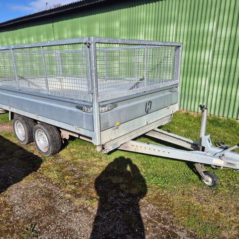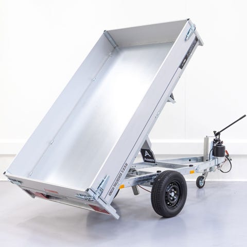 Anssems 3vejs top trailer . Traileren er en to-akslet model med sider og stålbund. Den er udstyret med næsehjul og påløbsbremse. Skiltet angiver en totalvægt på 3000 kg med akselbelastninger fordelt på 1500 kg pr. aksel. Velegnet til transport af gods, haveaffald, grus materialer og lignende opgaver, hvor der er behov for en robust trailer med høj lasteevne.