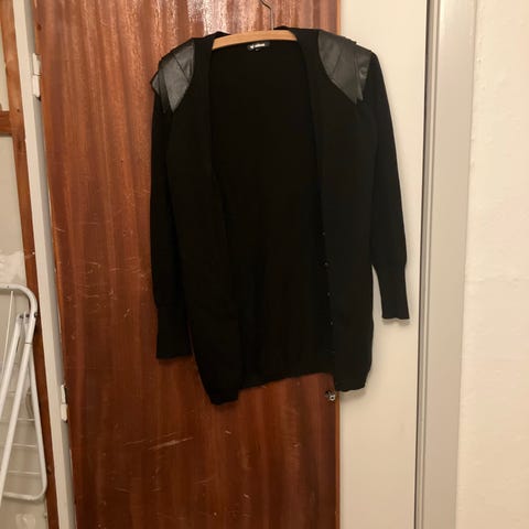 Monki cardigan til damer i størrelse XS. Cardiganen er grå og fremstillet i uld. Åben model uden lukning med lange ærmer. Foran er der lommer med mørk kantdetalje. Velegnet som let overtøj eller ekstra lag over bluser og kjoler.