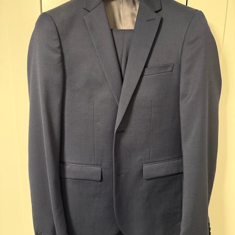 Matinique jakkesæt til herre i uld, størrelse 46. Sættet består af jakke og bukser i blå farve. Jakkesættet har klassisk revers, lommer med klap og inderlommer. Bukserne er enkle med pressefolder.