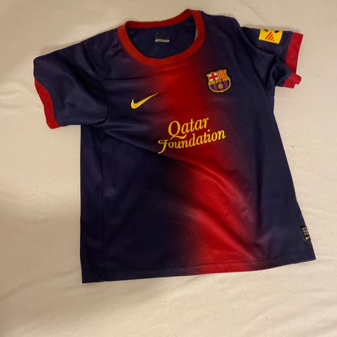 Nike FC Barcelona fodboldtrøje med vertikale røde og blå striber. Trøjen har klublogo på brystet og Nike-logo på højre side. På ryggen står der "Larsson" og nummer 7. Kortærmet model i let, åndbart materiale egnet til fodbold og anden sport. Velegnet som kamptrøje, træningstrøje eller til hverdagsbrug for fans af FC Barcelona. Str. XL barn