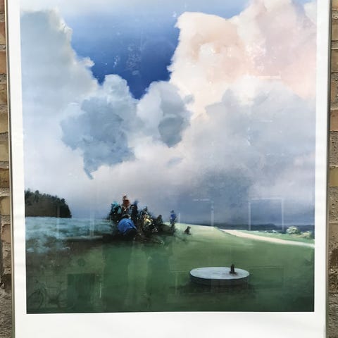 Kunsttryk indrammet billede med motiv af en mand, der sidder ved et bord på en strand, samt en gris i forgrunden. I baggrunden ses hav og klitter under en dramatisk himmel. Billedet er monteret i sort ramme med hvid passepartout og ophæng på bagsiden, klar til at blive hængt op på væggen. Velegnet som vægdekoration i stue, kontor eller andre opholdsrum.