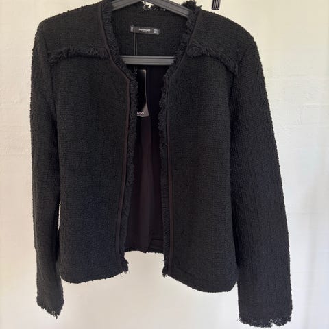 Mango jakke til kvinder i størrelse XL. Jakken er i lyseblå farve og har en struktureret, vævet overflade med rund hals og knaplukning foran. Modellen er kort i snittet og har lange ærmer. Materialesammensætningen indeholder bomuld samt andre fibre, som fremgår af vaskeanvisningen. Egnet som let jakke eller blazer-inspireret overtøj til hverdags- og pænere brug. Aldrig brugt. Størrelsen er til den lille side.