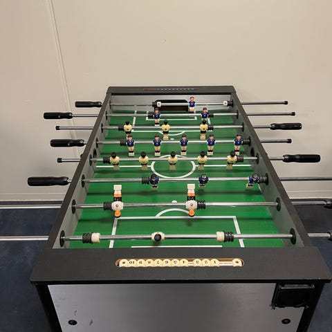 Bordfodboldbord med grøn spilleflade og sorte ben