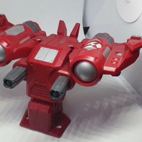 Bandai actionfigur i rød plast med guld- og sorte detaljer. Figuren har bevægelige led i arme og ben. Størrelse og serie er ikke angivet på figuren, men den er mærket med Bandai på foden. Velegnet som legetøj eller som samlerfigur.