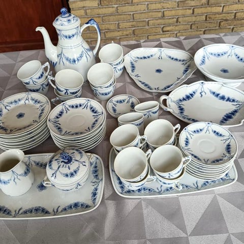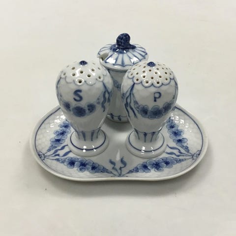 Bing & Grøndahl Empire, plat de menage med saltbøsse, peberbøsse og sennepskrukke i tilhørende holder.
