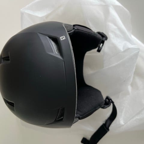 Salomon skihjelm i sort med lyse indersider og ørebeskyttere. Hjelmen har justerbar hagerem og ventilationsåbninger i sider og top. Velegnet til alpint skiløb eller snowboarding. Passer til brug med skibriller, som kan fastgøres bagpå hjelmen med den integrerede holder.