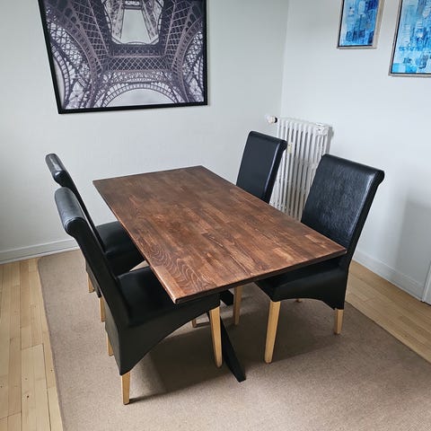 "Striben" på ryglænet forsvinder igen. Det er kun fordi, de har stået op ad bordet. Kan aftørres med en våd klud. Der er en lille rids bagpå et af ryglænene (se sidste billede). Prisen er ialt