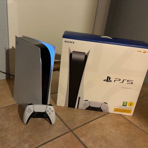 Sony Playstation 5 konsol i hvid med indbygget diskdrev. Konsollen er velegnet til spil, streaming og underholdning. Medfølgende sort Sony DualSense trådløs controller med touchpad, trigger-knapper og indbygget bevægelsessensor.