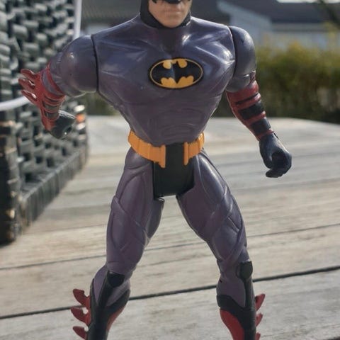 Kenner Batman actionfigur i lilla og sort plast med aftagelig sort kappe og guldfarvet økse. Figuren forestiller Batman i rustningslignende dragt med bevægelige led. Velegnet som samlerfigur eller legetøj til leg med superhelteuniverset. Tekst med producentoplysninger er præget på figurens ben.
