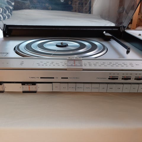 Forstærker, pladespiller og tuner ok. Kassettespiller virker ikke. DIN stik overalt.