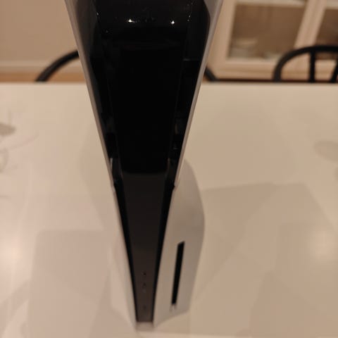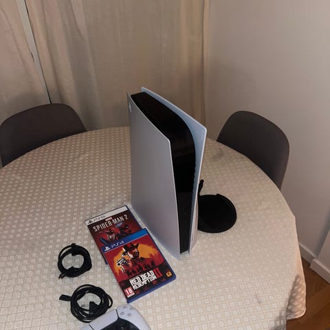 Sony PlayStation 5 konsol i hvid. Konsollen leveres med en DualSense trådløs controller samt nødvendige kabler, som ses på billederne.