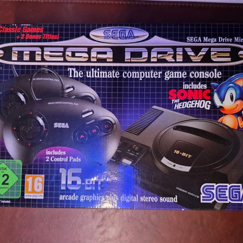 Sega Mega Drive Blaze AtGames spillekonsol med 15 indbyggede spil. Konsollen er en nyere udgave af den klassiske Sega Mega Drive og leveres med to kablede håndcontrollere i sort. På kassen fremgår blandt andet spil som Sonic & Knuckles og flere andre klassiske titler.