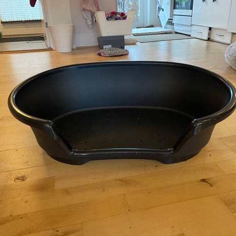 Plast hundekurv i sort. Oval model med lav indstigning foran og ventilationshuller i bunden. Egnet til brug indendørs som liggeplads til hund. Kan bruges med løs pude eller tæppe efter behov.