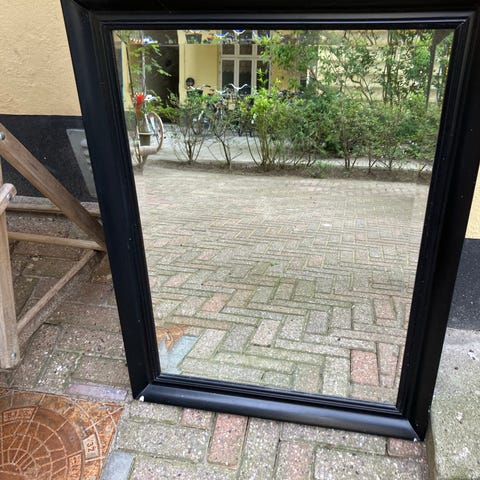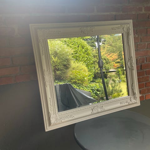 Stort spejl i hvidt fyrretræ. Smuk ramme med fine detaljer og facetslebet spejl. Perfekt til entré’en eller påklædningsværelset.