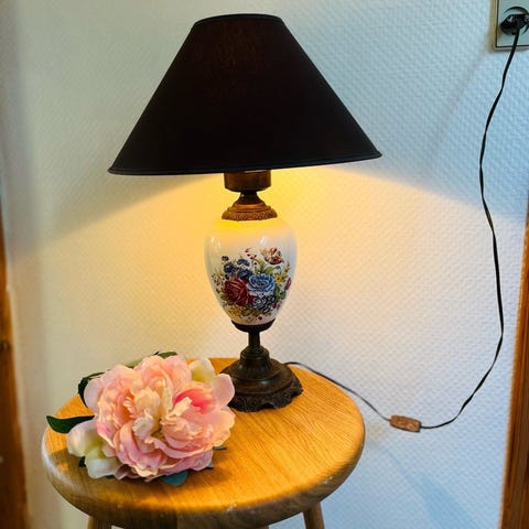 Bordlampe i porcelæn med blomstermotiv 23 cm høj.