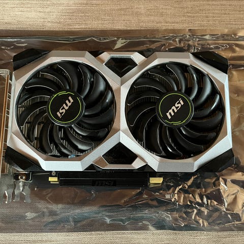 MSI GeForce RTX 2070 Ventus 8G grafikkort med dual-fan køleløsning. Kortet er baseret på Nvidias GeForce RTX 2070 GPU og har 8 GB videohukommelse (angivet som 8G på mærkaten). Det er et PCIe-grafikkort med bagplade og flere video-udgange på I/O-panelet. Egnet til stationære computere, hvor der er behov for et dedikeret grafikkort til grafisk krævende opgaver og spil, forudsat kompatibelt bundkort og tilstrækkelig strømforsyning.