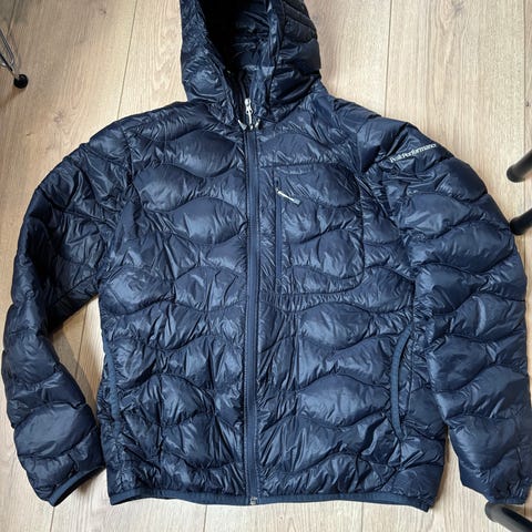 Peak Performance vinterjakke til herre i størrelse L, men passer perfekt som XL. Jakken er mørkeblå og fyldt med dun, hvilket giver god isolering i koldt vejr. Modellen har gennemgående lynlås med trykknapper, justerbar hætte og snøre forneden. Ydermaterialet er glansfuldt og vatteret i brede kanaler. Egnet som varm vinterjakke til daglig brug og udendørsaktiviteter.