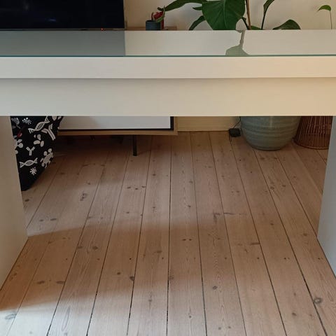 Fint IKEA sminkebord / skrivebord med glasplade og skuffer. Få brugsspor i form af ridser på pladen, men det er svært at se :-) Skuffen virker godt og det kan følge “bestikbakker” med til opdeling i den.